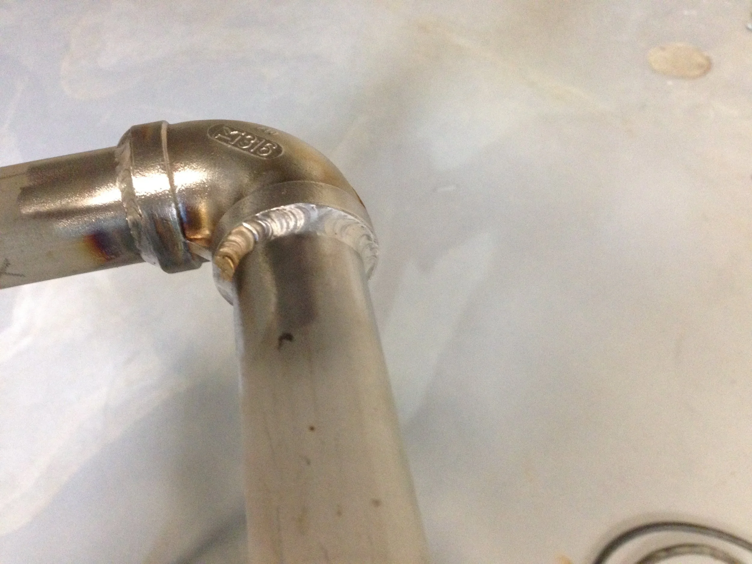 Close-up view of two metallic plumbing pipes connected with a welded elbow joint in a bathroom or kitchen sink area.