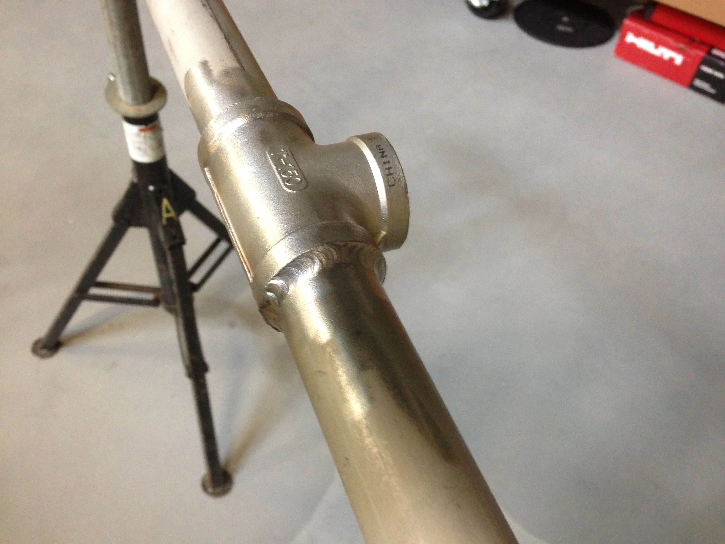 Close-up of a metal welding joint connecting three cylindrical metal pipes, on a workshop floor.